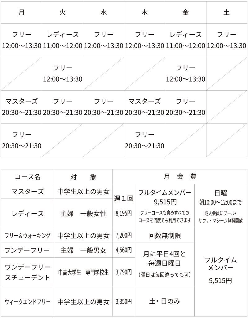 ご主人や学生の健康増進、OL、ご婦人の美容と健康には、スイミングが一番です。気軽にマイペースで泳ぎたい(のんびり水中を歩きたい)方はフリーコースを、泳ぎに自信のない方や、さらに泳力の向上を求める方は、マスターズコース、レディースコースをご利用ください。